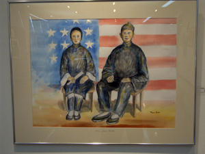 “1850… New Roots,” (pictured above) is an eye-catching painting depicting two Chinese in traditional dress against a background of the American flag. The painting is the work of Tom Hom, father of Gayle Hom.